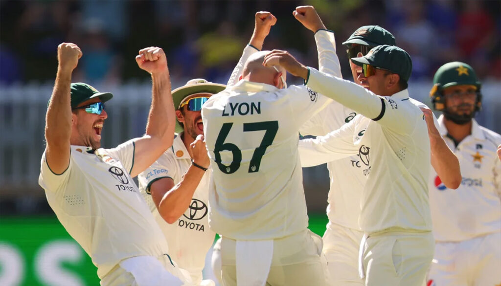 পার্থ টেস্টের চতুর্থ দিনেই পাকিস্তানকে গুড়িয়ে দিয়ে বড় জয় তুলে নিয়েছে অস্ট্রেলিয়া। ম্যাচের তৃতীয় দিন শেষেই দ্বিতীয় ইনিংসে লিড তিনশ ছুঁয়ে ফেলে অস্ট্রেলিয়া। শনিবার এর সঙ্গে তারা যোগ করে আরও ১৪৯ রান। ৫ উইকেটে ২৩৩ রানে দ্বিতীয় ইনিংস ঘোষণা করে স্বাগতিকরা। ৪৫০ রানের পাহাড়সম টার্গেট তাড়ায় শান মাসুদের দল ৩০.২ ওভারে মাত্র ৮৯ রানেই গুটিয়ে যায়। ৩৬০ রানের বড় জয় তুলে ৩ ম্যাচ টেস্ট সিরিজে ১-০ ব্যবধানে এগিয়ে গেলো প্যাট কামিন্সের দল।