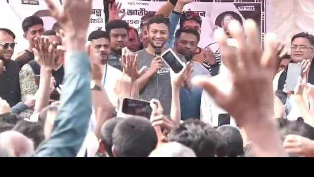 সাকিব বলেন, আমি খেলাধুলার মানুষ, ক্রিকেট খেলি। তবে অন্যান্য খেলাও আপনাদের সাথে খেলতে পারবো। আর সেই সুযোগ করে দেয়ার জন্য আপনারা ৭ জানুয়ারি সকাল সকাল ভোটকেন্দ্রে গিয়ে নৌকা মার্কায় ভোট দিয়ে আমাকে জয়যুক্ত করবেন।
