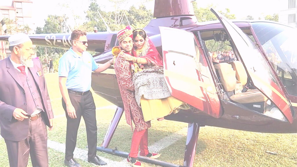 এদিকে হেলিকপ্টার দেখতে আশপাশের এলাকা থেকে ভিড় জমান হাজারও উৎসুক জনতা। পরে নববধূ ও বরকে ফুল দিয়ে বরণ করে নেয় পরিবার ও আত্মীয়-স্বজনরা।