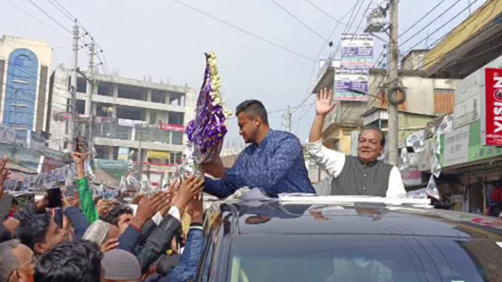 ভোটারদের সাথে হাত মিলিয়ে শামীম হকের জন্য নৌকা প্রতীকে ভোট চান।