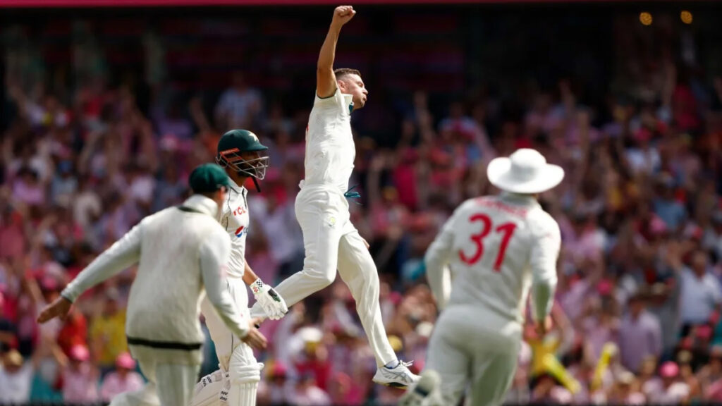 তবে ৩৩ রান করা আইয়ুবকে এলবিডব্লিউর ফাঁদে ফেলে ৫৭ রানের জুটি ভাঙেন ন্যাথান লায়ন। কিছুক্ষণ পর সাজঘরের পথ ধরেন বাবর আজমও। ট্রাভিস হেডের শিকার হওয়ার আগে ২৩ রান করেন তিনি। এরপর দিনের দ্বিতীয় শেষ ওভারে এসে একে একে ৩ উইকেট তুলে নেন হ্যাজেলউড। তার প্রথম বলে স্লিপে থাকা স্টিভেন স্মিথের হাতে ক্যাচ দেন সাউদ শাকিল। তৃতীয় বলে নাইটওয়াচম্যান হিসেবে আসা সাজিদ খানের স্টাম্প উড়িয়ে দেন ডানহাতি এই পেসার। আর পঞ্চম বলে শিকার করেন সালমান আলী আঘাকে।