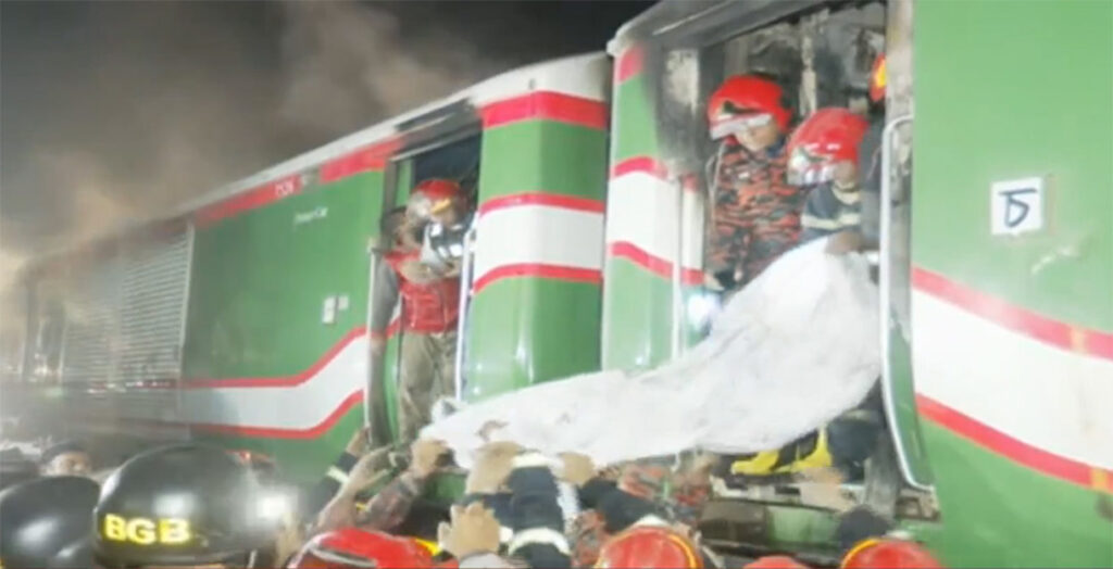 রাজধানীর সায়দাবাদের গোপীবাগে বেনাপোল এক্সপ্রেস ট্রেনে দুর্বৃত্তদের দেয়া আগুনে এখন পর্যন্ত ৪ জনের মরদেহ উদ্ধার করা হয়েছে বলে জানিয়েছে ফায়ার সার্ভিস। তবে ভেতরে আরও মরদেহ থাকতে পারে বলে ধারণা করা হচ্ছে। মরদেহ উদ্ধারে কাজ করছে ফায়ার সার্ভিসের ৭ ইউনিট।