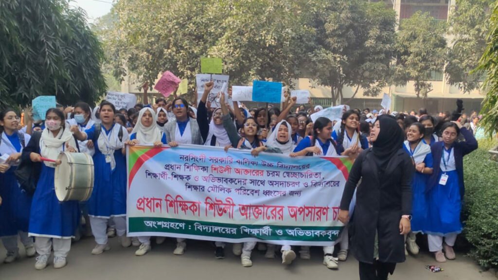 নরসিংদী সরকারি বালিকা উচ্চ বিদ্যালয়ের প্রধান শিক্ষক শিউলী আক্তারের প্রত্যাহার চেয়ে ডিসি অফিস ঘেরাও করেছে বিদ্যালয়ের শিক্ষার্থীরা। রোববার (২৮ জানুয়ারি) বেলা এগারোটা থেকে দুপুর ২টা পর্যন্ত তিন শতাধিক শিক্ষার্থী ডিসি অফিস ঘেরাও করে অবস্থান কর্মসূচি পালন করেন।