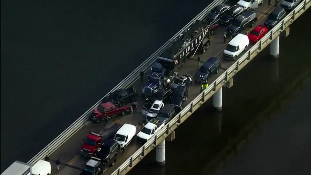 একসাথে ৪৩টি গাড়ির সংঘর্ষ! এমন ঘটনাই হয়েছে যুক্তরাষ্ট্রের ম্যারিল্যান্ডে। চিজপিক বে সেতু পার হওয়ার সময় হঠাৎ একটি গাড়িকে ধাক্কা দেয় একটি লরি। দ্রুত ব্রেক করতে বাধ্য হয় পেছনের যানবাহনগুলো। তবে দ্রুত গতির কারণে, একের পর এক গাড়ির ধাক্কা লাগে সামনের গুলোতে।