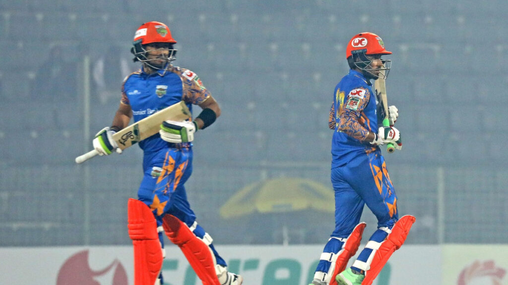 সোমবার (২৯ জানুয়ারি) সিলেট আন্তর্জাতিক ক্রিকেট স্টেডিয়ামে টস জিতে ব্যাটিং করতে নেমে শুরু থেকেই সাবধানী ব্যাটিং করেন ঢাকার দুই ওপেনার সায়ুম আইয়ুব এবং নাইম শেখ। মাঝে দ্রুত রান তোলার চেষ্টা করলেও খুব বেশি ফলপ্রসূ হয়নি। যদিও পাওয়ারপ্লেতে কোনো উইকেট হারায়নি তারা। পাওয়ারপ্লের শেষ ওভারে নাইমকে ফেরানোর সুযোগ থাকলেও মোহাম্মদ ওয়াসিম জুনিয়রের বলে দারুণ প্রচেষ্টার পরও ক্যাচ লুফে নিতে পারেননি আনামুল হক বিজয়। প্রথম ৬ ওভার শেষ হওয়ার পরই অবশ্য ব্যাট হাতে ঝড় তোলেন ঢাকার ওপেনাররা।