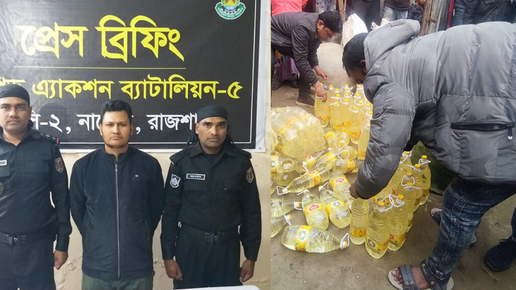 নাটোর র্যাব ক্যাম্পের কোম্পানি অধিনায়ক সনজয় কুমার সরকার জানান, বোতলজাত সয়াবিন তেল ড্রামে রাখছিলেন শাহ আলম খন্দকার। এতে স্থানীয়দের সন্দেহ হলে তারা বিষয়টি র্যাবকে জানায়। পরে র্যাব সদস্যরা শাহ আলম খন্দকারের বাড়িতে অভিযান চালায়। এ সময় বাড়ির টয়লেট ও খড়ি রাখার ঘর থেকে দুই লিটারের বোতল ও ড্রামে রাখা ৩৫০ লিটার টিসিবির সয়াবিন তেল জব্দ করে। এছাড়া শাহ আলমকে আটক করা হয়।
