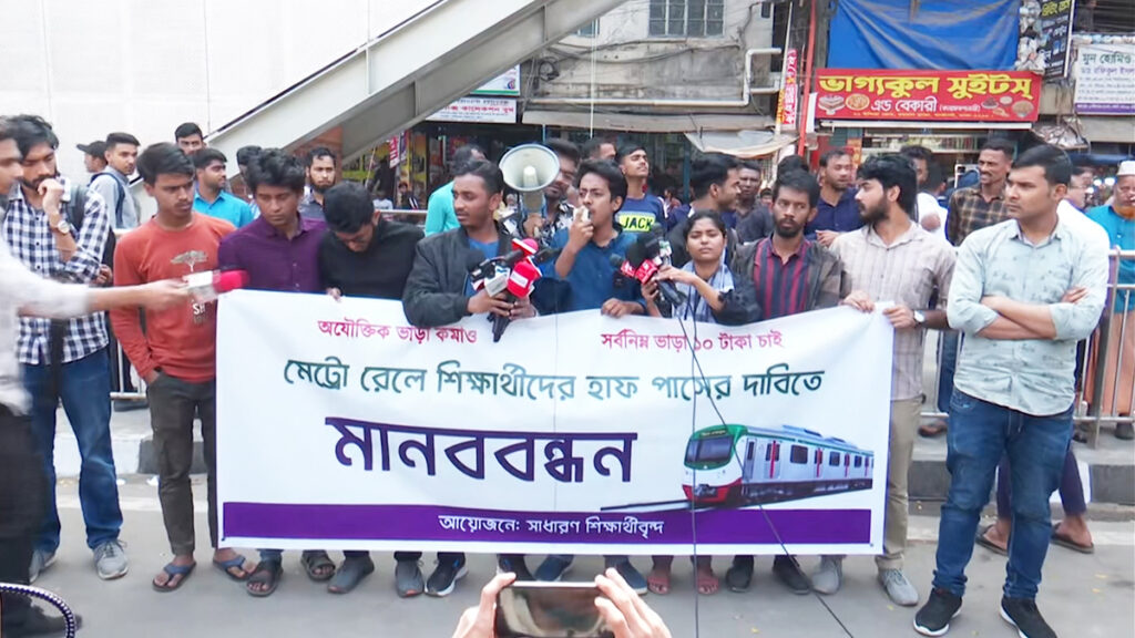 শনিবার (৩ ফেব্রুয়ারি) দুপুরে সাধারণ শিক্ষার্থীদের ব্যানারে রাজধানীর ফার্মগেটে মেট্রোরেল স্টেশনের সামনে এই মানববন্ধন করে শিক্ষার্থীরা। মানববন্ধনে মেট্রোরেলের সর্বনিম্ন ভাড়া ১০ টাকা করার দাবি জানায় তারা।