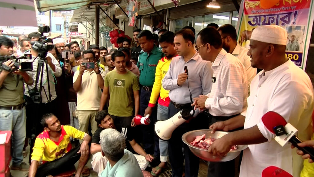 তারই দোকন দেখতে সকালে মিরপুরে ছুটে যান ভোক্তার মহাপরিচালক। উজ্জ্বলের দেখাদেখি একই বাজারের ব্যবসায়ী খোকনও একই দামে মাংস বিক্রি করছেন।