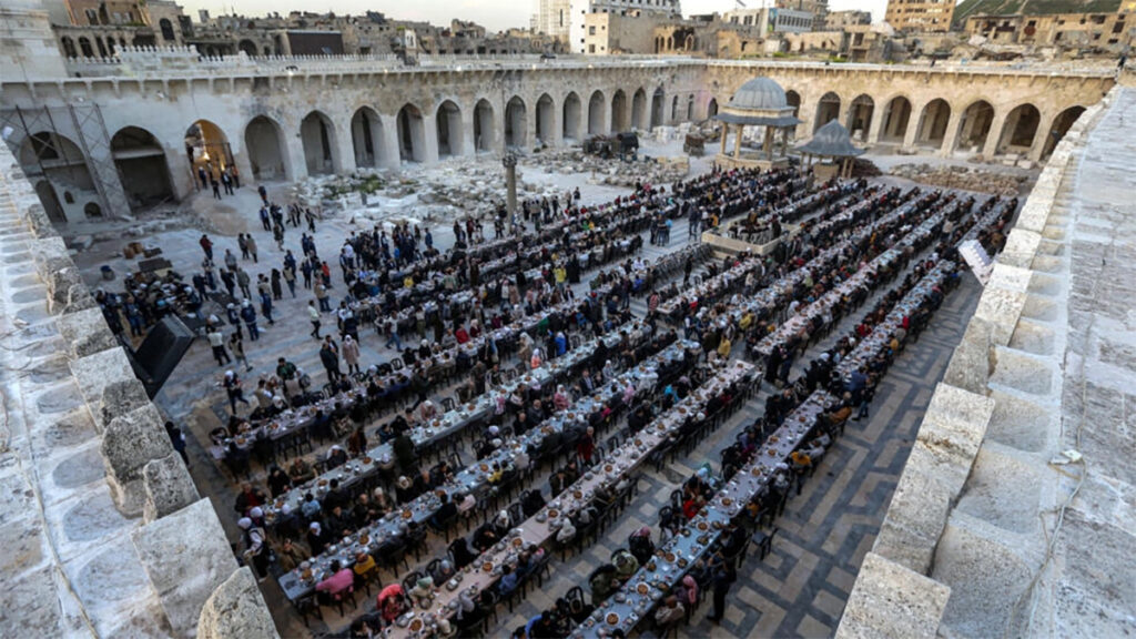 বিধ্বস্ত মসজিদগুলো সচলের উদ্যোগ হাতে নিয়েছে সরকার। এরই অংশ হিসেবে শনিবার (৩০ মার্চ) ইফতার আয়োজন করা হয় সেখানে। আলেপ্পোর বিভিন্ন এলাকা থেকে একত্রিত হন প্রায় দেড় হাজার মানুষ। মসজিদ প্রাঙ্গনে ধ্বংসস্তূপের মাঝেই ইফতার ও নামাজ আদায় করেন মুসল্লিরা।