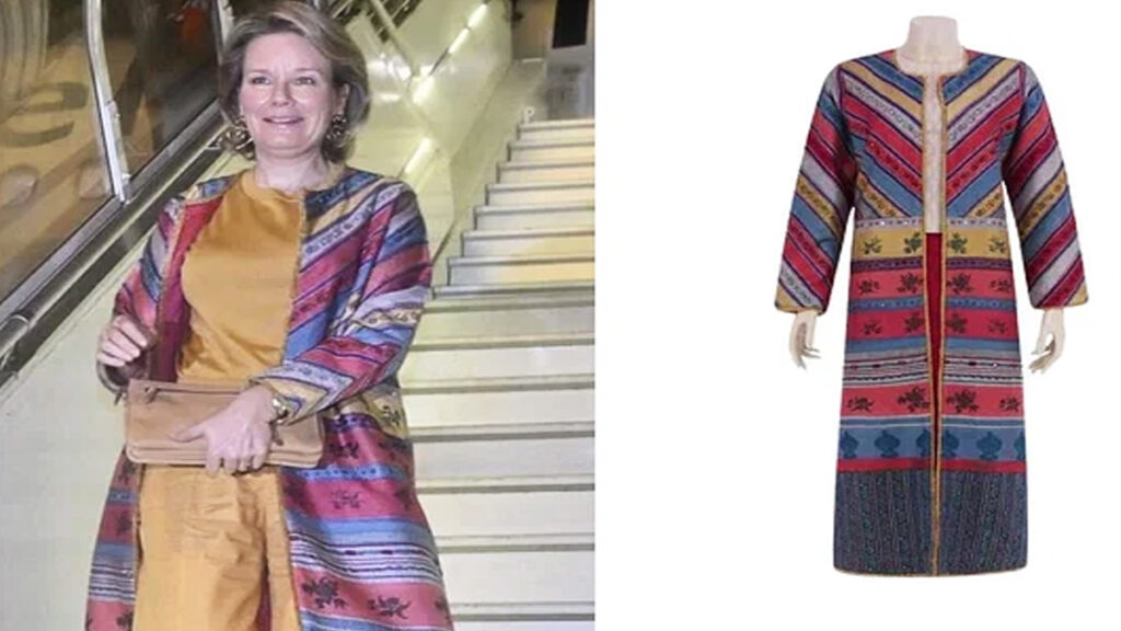 রানি মাথিল্ডে জ্যাকেটটি পরেছেন ধাতব সোনালি রঙের একরঙা কো-অর্ডস সেটের ওপর। প্যান্ট আর টপের ওপর জড়িয়েছেন জ্যাকেটটি। মেরুন আর নীলচে শেডের রঙিন মেলবন্ধন পোশাকটিকে আরও দৃষ্টিনন্দন করেছে। পোশাকটি তৈরি করেছে বাংলাদেশের লাইফস্টাইল ব্র্যান্ড আড়ং। তবে পোশাকটি বাংলাদেশে তৈরি হলেও রানি সেটি পরেছিলেন যখন তিনি আফ্রিকান দেশ আইভরি কোস্টে রাষ্ট্রীয় সফরে গিয়েছিলেন। ইনস্টাগ্রামের ওই ছবিটি গত মার্চের ৩ তারিখে তোলা।