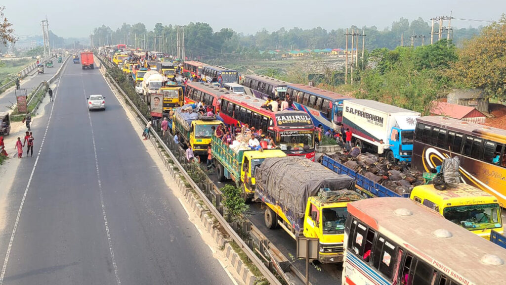 দূরপাল্লার গণপরিবহনের পাশাপাশি এই মহাসড়কে মোটরসাইকেল ও ব্যক্তিগত যানবাহনও বেড়েছে। এছাড়া খোলা ট্রাক, বাস ও পিকআপ করে জীবনের ঝুঁকি নিয়ে গন্তব্যে পৌঁছাচ্ছে অনেককেই। তবে একেবারে যানজটে পড়ে ঘণ্টার পর ঘণ্টা দুর্ভোগ পোহাতে হচ্ছে না ঘরমুখো মানুষদের।