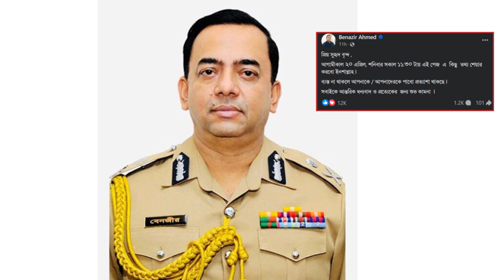 আজ শনিবার (২০ এপ্রিল) নিজের ব্যবহৃত ফেসবুক অ্যাকাউন্টে গুরুত্বপূর্ণ তথ্য শেয়ার করার কথা জানিয়েছেন পুলিশের সাবেক মহাপরিদর্শক (আইজিপি) ড. বেনজীর আহমেদ। গতকাল শুক্রবার রাত সাড়ে ৯টার দিকে নিজের ভেরিফায়েড পেজে এ ধরনের একটি পোস্ট করেন সাবেক এই পুলিশপ্রধান।