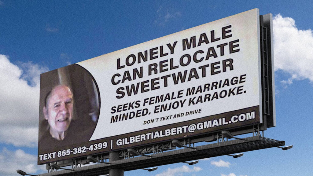 প্রায় ২০ ফুটের বিলবোর্ডটিতে গিলবার্টির হাসিমুখের একটি ছবি আছে। সাথে লেখা আছে কিছু বার্তা। লেখা রয়েছে, গিলবার্টি একজন একাকী পুরুষ। অন্যত্র যেতেও রাজিও তিনি। শুধু দরকার বিয়ের জন্য একজন নারীর!