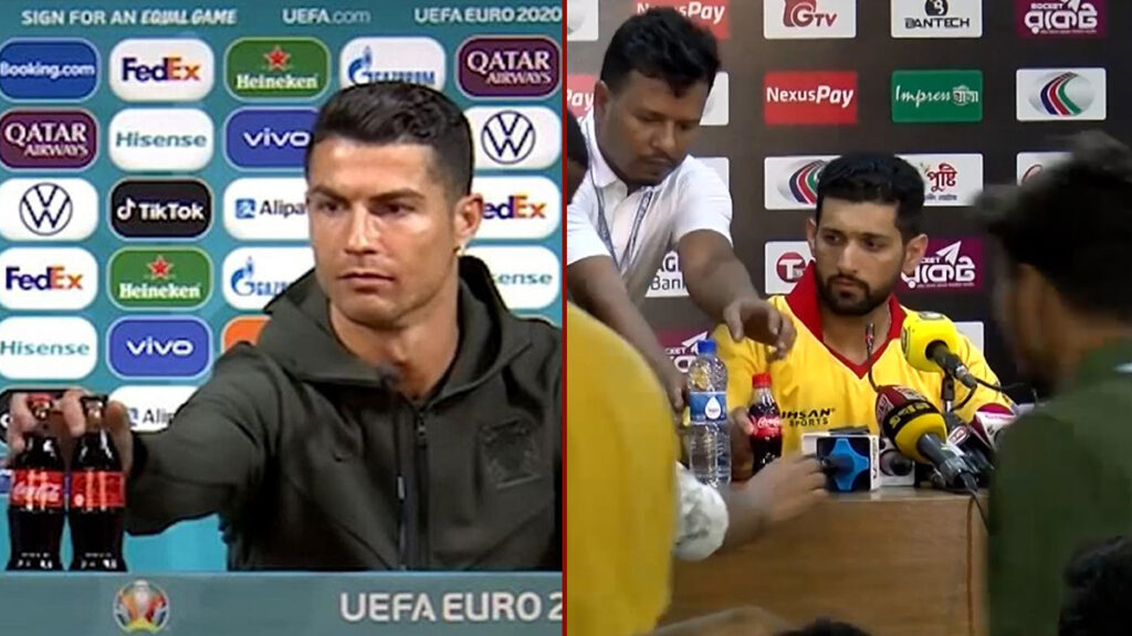 বছর দুয়েক আগে ইউরোপিয়ান চ্যাম্পিয়নশিপ চলাকালে একবার সংবাদ সম্মেলনে এসে টেবিলে রাখা কোমল পানীয়র একটি বোতল সরিয়ে রেখেছিলেন ক্রিশ্চিয়ানো রোনালদো। পর্তুগিজ মহাতারকার এমন কাণ্ডে সেবার তুমুল আলোচনার জন্ম দিয়েছিল। এমনকি রোনালদোর বোতল সরানোর ঘটনায় কোম্পানিটিরও বিপুল আর্থিক ক্ষতি হয়েছিল বলে জানা যায়। এবার একই কাণ্ড ঘটিয়েছেন সিকান্দার রাজাও।