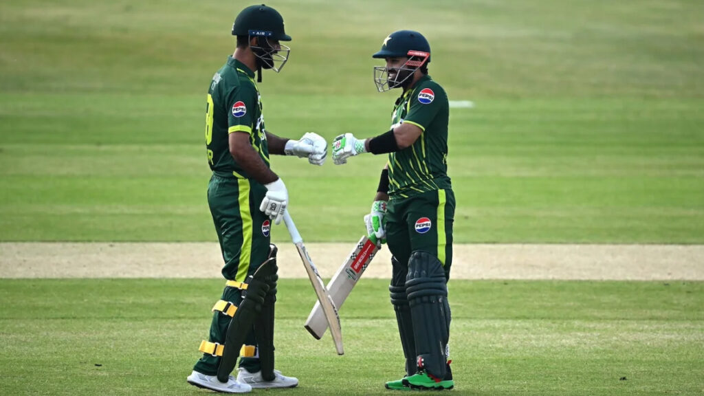 পরের ওভারে গ্রাহাম হিউমের বলে আলগা শটে বাবর আজম বিদায় নেন শূন্য রানে। তখন ১৩ রানে ২ উইকেট নেই পাকিস্তানের। সময় যত বাড়তে থাকে ততই রান তোলার গতি বাড়াতে থাকেন তারা দুজন। প্রথম দুই ওভারে দুই উইকেট হারালেও পাওয়ার প্লেতে ৫৭ রান তোলে পাকিস্তান।