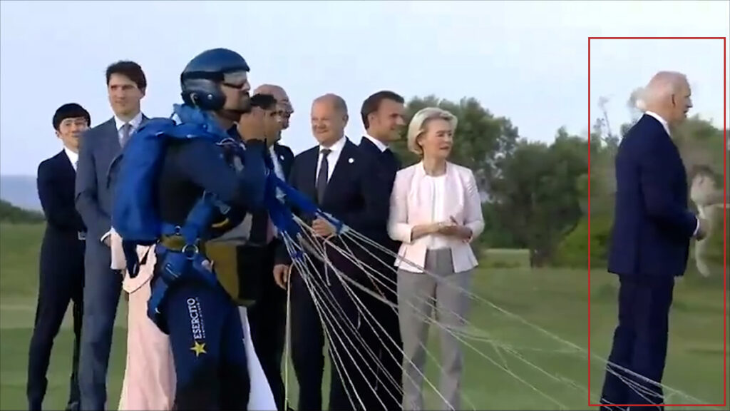 এক ভিডিওতে দেখা যায়, ইতালির প্রধানমন্ত্রী জর্জিয়া মেলোনির সাথে আলাপের মাঝেই হঠাৎ তাকে স্যালুট দিচ্ছেন বাইডেন। সম্মেলনের প্রকাশিত আরেক ভিডিওতে দেখা যায়, জোটের অন্যান্য নেতারা ছবির তোলার জন্য একদিকে দাঁড়িয়ে থাকলেও বাইডেন হঠাৎ-ই ঘুরে দাঁড়ান। এরপর একটু দূরে সরে গিয়ে অদ্ভুতভাবে হাসতে থাকেন।