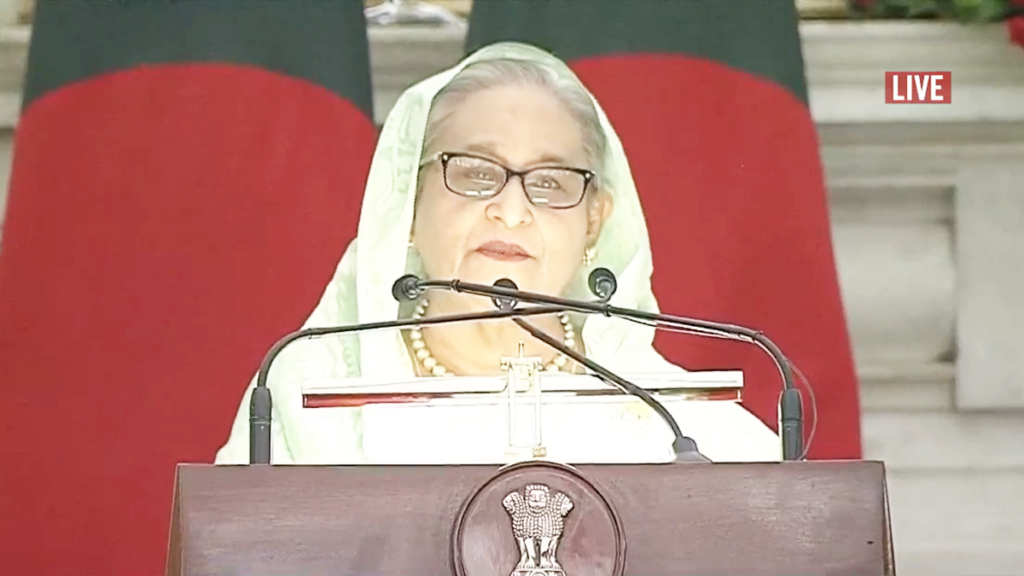 বক্তব্যের শুরুতে নয়াদিল্লিতে রাষ্ট্রীয় সফরে আমন্ত্রণ জানানোর জন্য নরেন্দ্র মোদির প্রতি আন্তরিক কৃতজ্ঞতা প্রকাশ করেন শেখ হাসিনা। তিনি বলেন, ২০২৪ সালের জানুয়ারি মাসে দ্বাদশ জাতীয় সংসদ নির্বাচনের মাধ্যমে নতুন সরকার গঠনের পর এটিই কোনো দেশে আমার প্রথম দ্বিপাক্ষিক সফর। আমাকে ও আমার প্রতিনিধিদলকে উষ্ণ আতিথেয়তা প্রদান করায় ভারত সরকারকে আন্তরিক ধন্যবাদ জানাচ্ছি। ভারত বাংলাদেশের সবচেয়ে বড় প্রতিবেশি, বিশ্বস্ত বন্ধু ও আঞ্চলিক অংশীদার। ১৯৭১ সালে মহান মুক্তিযুদ্ধের মাধ্যমে শুরু হওয়া ভারতের সঙ্গে আমাদের সম্পর্ককে বাংলাদেশ সবসময়ই বিশেষ গুরুত্ব প্রদান করে। মহান মুক্তিযুদ্ধে ভারত সরকার এবং ভারতের জনগণের অবদানকে কৃতজ্ঞতার সঙ্গে স্মরণ করছি। ভারতের সেইসব বীরদের প্রতি গভীর শ্রদ্ধা জানাচ্ছি, যারা ১৯৭১ সালের আমাদের মহান মুক্তিযুদ্ধে তাদের জীবন উৎসর্গ করেছিলেন।