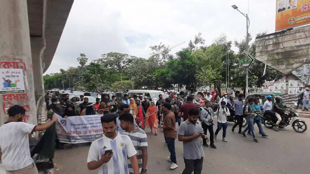 এদিকে, ঢাকা বিশ্ববিদ্যালয় এলাকা থেকেও শুরু হয়েছে আন্দোলন কর্মসূচী। ঢাকা বিশ্ববিদ্যালয় থেকে একটি মিছিল শুরু হয়ে সব হল প্রদক্ষিণ করে শাহবাগ মোড়ে জড়ো হন শিক্ষার্থীরা। এ সময় দাবি না মানা পর্যন্ত আন্দোলন চালিয়ে যাওয়ার কথা বলেন শিক্ষার্থীরা।