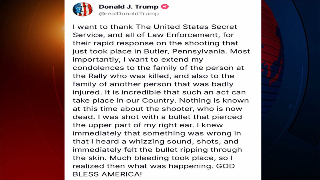 পোস্টে তিনি লিখেছেন, ‘হামলাকারী গুলি ছোড়ার সঙ্গে সঙ্গেই দ্রুত পদক্ষেপ নেওয়ায় জন্য প্রথমেই ধন্যবাদ দিতে চাই সিক্রেট সার্ভিস ও আইনশৃঙ্খলা রক্ষাকারী বাহিনীকে। এটা অবিশ্বাস্য যে আমাদের দেশে এ রকম একটি ঘটনা ঘটেছে। হামলাকারী সম্পর্কে এখনো কিছু জানা যায়নি। হামলাকারী নিহত হয়েছেন।’