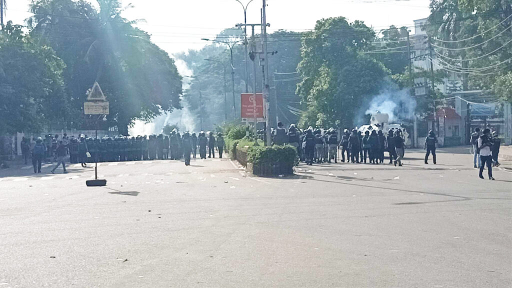 তাদের ওই মিছিলে একের পর এক সাউন্ড গ্রেনেড ও টিয়ারশেল নিক্ষেপ করে পুলিশ। এবার ছত্রভঙ্গ হয়ে যান শিক্ষার্থীরা। তবে কিছুক্ষণের মধ্যে তারা আবারও সূর্য সেন হলের সামনে এসে জড়ো হন। এরমধ্যে আধুনিক ভাষা ইনস্টিটিউটের ছাদ থেকে শিক্ষার্থীরা পুলিশকে উদ্দেশ্য করে ইটপাটকেল ছুড়েছেন। আর উপাচার্যের বাসভবনের কাছে অবস্থান নিয়েছে বিপুলসংখ্যক পুলিশ, র্যাব ও বিজিবি।