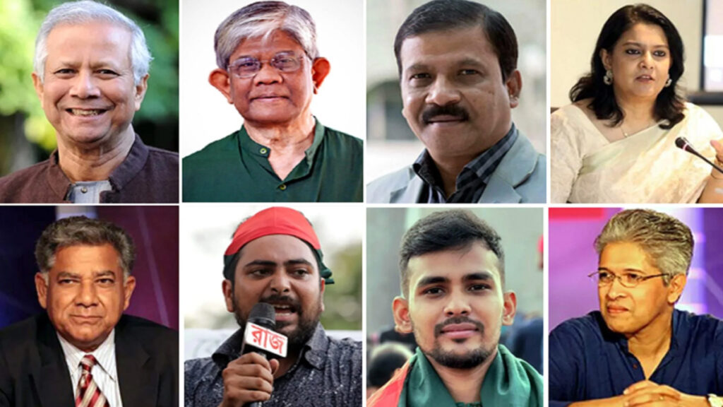 ১৬ উপদেষ্টা হচ্ছেন— বাংলাদেশ ব্যাংকের সাবেক গভর্নর সালেহ উদ্দিন আহমেদ, ঢাকা বিশ্ববিদ্যালয়ের শিক্ষক ড. আসিফ নজরুল, মানবাধিকার সংগঠন অধিকারের সম্পাদক আদিলুর রহমান খান, তত্ত্বাবধায়ক সরকারের সাবেক উপদেষ্টা ও সাবেক অ্যাটর্নি জেনারেল এ এফ হাসান আরিফ, সাবেক পররাষ্ট্র সচিব তৌহিদ হোসেন, বাংলাদেশ পরিবেশ আইনবিদ সমিতির (বেলা) প্রধান নির্বাহী ও সুপ্রিম কোর্টের আইনজীবী সৈয়দা রিজওয়ানা হাসান, বৈষম্যবিরোধী ছাত্র আন্দোলনের সমন্বয়ক মো. নাহিদ ইসলাম ও আসিফ মাহমুদ সজীব ভূঁইয়া, সাবেক নির্বাচন কমিশনার ব্রিগেডিয়ার জেনারেল (অব.) এম সাখাওয়াত হোসেন, সাবেক রাষ্ট্রদূত ও পার্বত্য চট্টগ্রাম উন্নয়ন বোর্ডের চেয়ারম্যান সুপ্রদীপ চাকমা, উন্নয়ন বিকল্পের নীতি নির্ধারণী গবেষণার (উবিনীগ) নির্বাহী পরিচালক ফরিদা আখতার, জাতীয় মানসিক স্বাস্থ্য ইনস্টিটিউটের সাবেক পরিচালক ডা. বিধান রঞ্জন রায়, হেফাজতে ইসলাম বাংলাদেশের সাবেক নায়েবে আমীর আ ফ ম খালিদ হাসান, গ্রামীণ ব্যাংকের সাবেক ব্যবস্থাপনা পরিচালক নুরজাহান বেগম, ব্রতীর প্রধান নির্বাহী কর্মকর্তা শারমিন মুরশিদ ও মুক্তিযুদ্ধে অপারেশন জ্যাকপটের উপ-অধিনায়ক ফারুক-ই-আযম বীর প্রতীক।