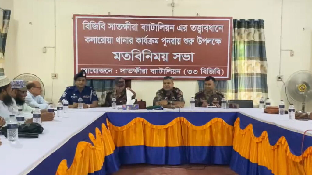 সেনাবাহিনী ও বিজিবি সহায়তায় সাতক্ষীরায় আটটি থানার মধ্যে চালু হয়েছে ছয়টি থানার কার্যক্রম। শনিবার (১০ আগস্ট) সকালে কলারোয়া থানা অডিটোরিয়ামে রাজনৈতিক দলের নেতৃবৃন্দ ও ছাত্র সমন্বয়কদের নিয়ে বৈঠক করেন সাতক্ষীরা ৩৩ বিজিবি অধিনায়ক লে. কর্নেল আশরাফ। এ সময় তিনি সকলের সহযোগিতা কামনা করেন। রাজনৈতিক নেতৃবৃন্দ ও সুধীজনরা থানাকে সুরক্ষিত রাখার প্রত্যয় ব্যক্ত করেন।