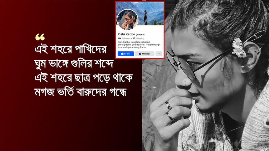 আন্দোলনে সামনে থেকে নেতৃত্ব দেয়া ‘ঋষি কাব্য’র কথা হয়তো অনেকেই ভুলে গেছেন। বৈষম্যবিরোধী আন্দোলনে হওয়া নির্যাতনের বহুচিত্র সামাজিক যোগাযোগমাধ্যমে আপলোড করা হতো তার ফেসবুক পেইজ থেকে।