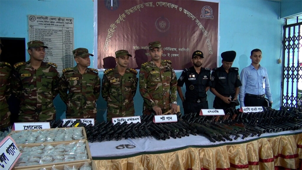 নরসিংদীতে সেনাবাহিনী কর্তৃক উদ্ধারকৃত ৬০টি আগ্নেয়াস্ত্রসহ ৪ হাজার রাউন্ড গুলি র্যাবের কাছে হস্তান্তর করা হয়েছে। গত ৫ আগস্ট রাজধানীর যাত্রাবাড়ীর র্যাব-১০ কার্যালয় থেকে লুট হওয়ার সময় নরসিংদী সেনাবাহিনী এসব অস্ত্র উদ্ধার করে।