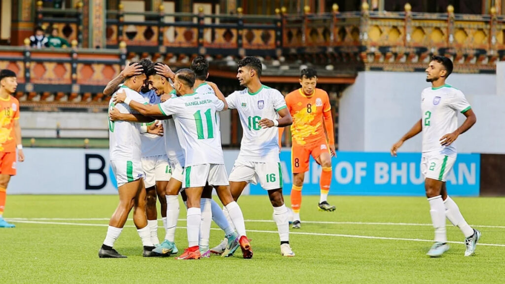 ম্যাচের শুরুতেই স্বাগতিকদের রক্ষণভাগকে ফাঁকি দিয়ে ৫ মিনিটেই গোলের দেখা পায় বাংলাদেশ। মাঠের ডান প্রান্ত দিক থেকে রাকিব হোসেনের বাড়ানো বল ক্লিয়ার করতে ব্যর্থ হন ভুটানের গোলরক্ষক। সেখান থেকে ডি বক্সের ভেতরে বল পেয়ে জালে জড়ান শেখ মোরসালিন। পিছিয়ে পড়ে ম্যাচে ফিরতে মরিয়া হয়ে খেলতে থাকে ভুটান। ম্যাচের ১৯ মিনিটে গোলের ভালো সুযোগ পায় তার। তবে গোলরক্ষক মিতুল মার্মার দক্ষতায় রক্ষা পায় বাংলাদেশ।
