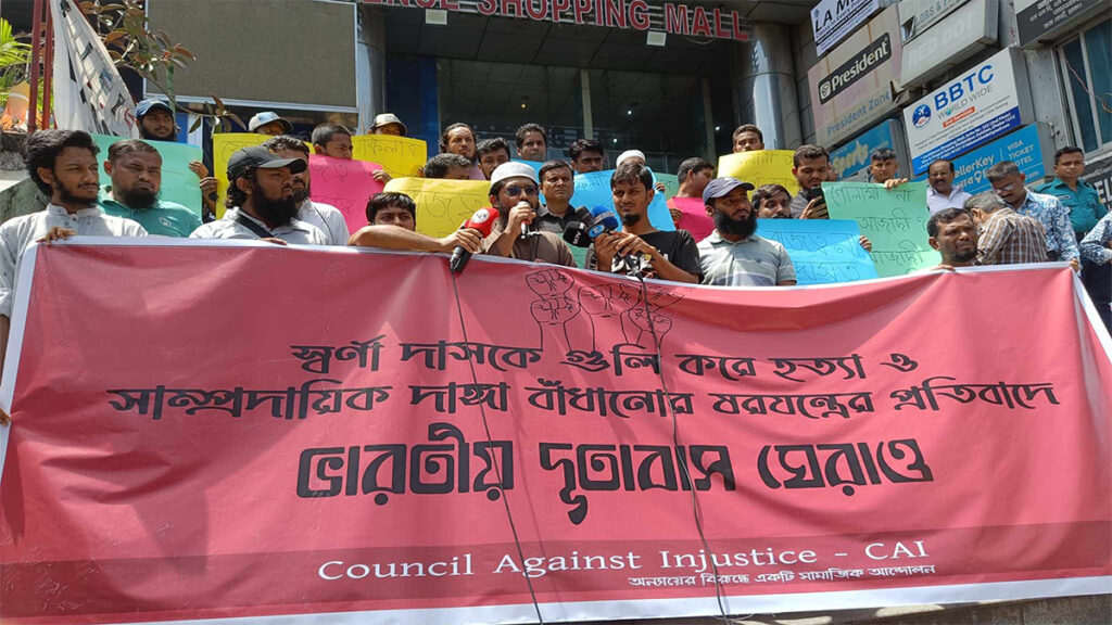 ভারতীয় মিডিয়ায় বাংলাদেশের বিরুদ্ধে মিথ্যা ও অপপ্রচার ছড়িয়ে সাম্প্রদায়িক দাঙ্গা বাধানোর ষড়যন্ত্র বন্ধের আহ্বান জানায় কাউন্সিল এগেইনস্ট ইনজাস্টিস। প্রতিবাদ স্বরূপ ‘ফেলানি, স্বর্ণা দাশকে গুলি করে হত্যা কেন’সহ নানা স্লোগান লিখিত প্ল্যাকার্ড নিয়ে মানববন্ধন করে সংগঠনটি।