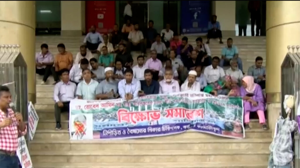 স্বাস্থ্য অধিদপ্তরের নবনিযুক্ত মহাপরিচালক অধ্যাপক ডা. রোবেদ আমিনসহ বিগত সরকারের একাধিক উচ্চপদস্থ স্বাস্থ্য কর্মকর্তার অপসারণের দাবিতে বিক্ষোভ-কর্মসূচি পালন করছে চিকিৎসক-নার্সসহ স্বাস্থ্যকর্মীরা।