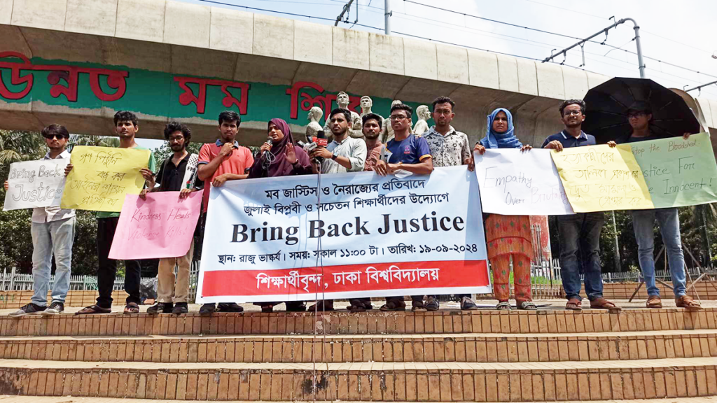 ঢাকা বিশ্ববিদ্যালয়ে চোর সন্দেহে তোফাজ্জল হোসেন নামে এক যুবককে পিটিয়ে মারার ঘটনায় সন্ধ্যা ৬টার মধ্যে অভিযুক্তদের গ্রেফতারের দাবি জানিয়েছেন শিক্ষার্থীরা। মব জাস্টিসের নামে হত্যা বন্ধ এবং ঘটনার সঙ্গে জড়িতদের বিচারের দাবিতে বিশ্ববিদ্যালয়ের রাজু ভাস্কর্যের সামনে এক কর্মসূচিতে তারা এ দাবি তুলে ধরেন।