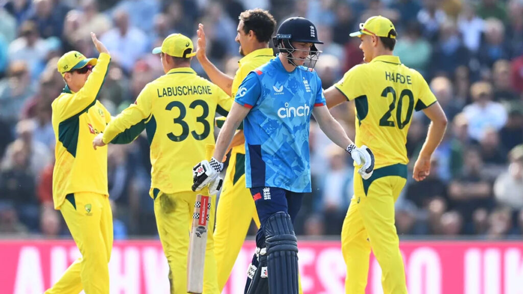 রান তাড়ায় নামা ইংল্যান্ডকে শুরু থেকেই চেপে ধরে অস্ট্রেলিয়ান বোলাররা। হ্যাজলউড ফিল সল্টকে ফেরানোর পর স্টার্ক ফেরান উইল জ্যাকস ও হ্যারি ব্রুককে। শুরুর ধাক্কা সামলানোর আগেই অ্যারণ হার্ডির জোড়া আঘাত। ৬৫ রানে ৫ উইকেট হারিয়ে ম্যাচ থেকে ছিটযে যায় ব্রুকের দল। শেষ দিকে স্মিথ প্রতিরোধ গড়ার চেষ্টা করলেও তা যথেস্ট ছিল না জয়ের জন্য। শেষ পর্যন্ত ২০২ রানে শেষ হয় ইংল্যান্ডের ইনিংস।