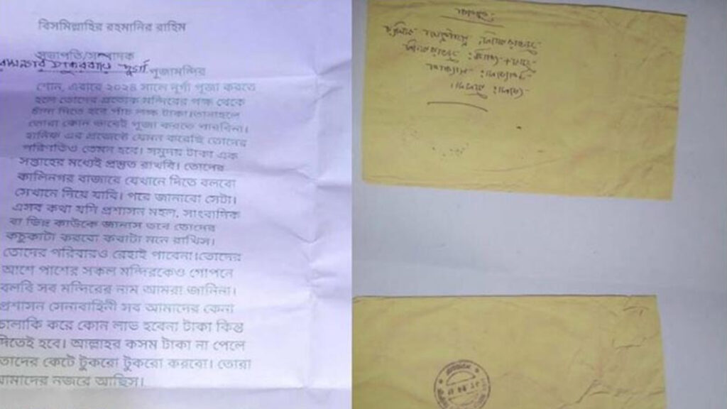 দুর্গাপূজা করতে হলে প্রতিটি মন্দির থেকে ৫ লাখ টাকা দিতে হবে এমন উড়ো চিঠি পেয়েছে খুলনার দাকোপ উপজেলার কয়েকটি মন্দির কমিটি। চিঠিগুলোতে নির্দিষ্ট স্থানে টাকা দেয়ার কথাও লেখা রয়েছে। পাশাপাশি বিষয়টি প্রশাসন ও সাংবাদিকদের জানালে ‘কচুকাটা’ করা হবে এমন হুমকিও দেয়া হয় চিঠিতে।