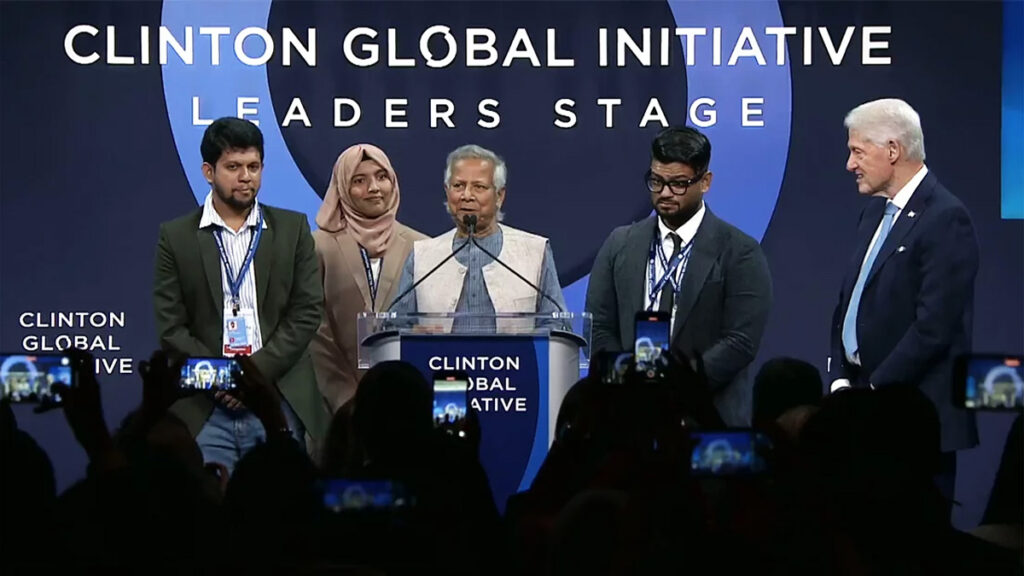 জাতিসংঘ সাধারণ পরিষদের ৭৯তম অধিবেশনে ফাঁকে মঙ্গলবার (২৪ সেপ্টেম্বর) সাবেক মার্কিন প্রেসিডেন্ট বিল ক্লিনটনের ‘ক্লিনটন গ্লোবাল ইনিশিয়েটিভ লিডারস স্টেজ’ অনুষ্ঠানে যোগ দেন ড. মুহাম্মদ ইউনূস। অনুষ্ঠানের মঞ্চে তিনি তার তিন সফরসঙ্গীকে পরিচয় করিয়ে দেন। এ সময় প্রধান উপদেষ্টা তার বিশেষ সহকারী মাহফুজ আলমকে এই বিশেষণে পরিচয় করিয়ে দেন।