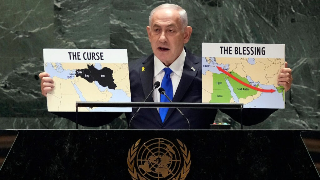 ইসরায়েলের প্রধানমন্ত্রী বেনিয়ামিন নেতানিয়াহু জাতিসংঘের সাধারণ পরিষদের অধিবেশনে ভাষণ দেয়ার সময় মধ্যপ্রাচ্যের দুটি মানচিত্র দেখিয়েছেন। শুক্রবার (২৮ সেপ্টেম্বর) অধিবেশনে তার দেখানো দুটো মানচিত্রে-ই নেই ‘ফিলিস্তিন’। এক প্রতিবেদনে মিডেল ইস্ট মনিটর এ তথ্য জানায়।
