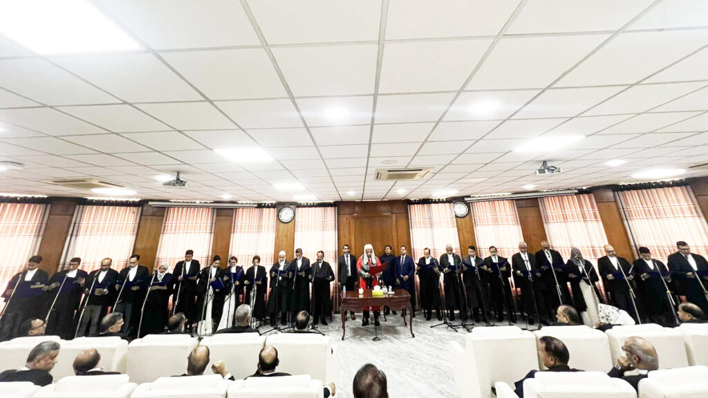 সুপ্রিম কোর্টের হাইকোর্ট বিভাগে নতুন নিয়োগ পাওয়া ২৩ বিচারপতি শপথ নিয়েছেন। আজ বুধবার (৯ অক্টোবর) সকাল ১১টায় সুপ্রিম কোর্টের জাজেস লাউঞ্জে নতুন এই বিচারপতিদের শপথ বাক্য পাঠ করান প্রধান বিচারপতি ড. সৈয়দ রেফাত আহমেদ। শপথ অনুষ্ঠান পরিচালনা করেন সুপ্রিম কোর্টের রেজিস্ট্রার জেনারেল আজিজ আহমদ ভূঞা।