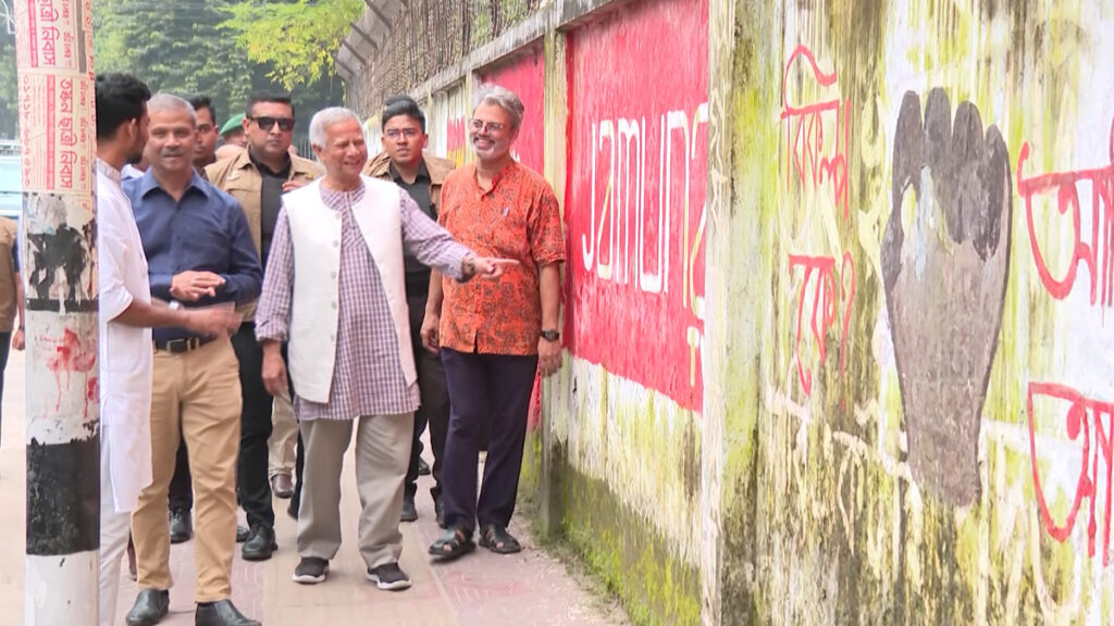 জুলাই ও আগস্টে ছাত্র-জনতার নেতৃত্বাধীন গণঅভ্যুত্থানের সময় তরুণ বিপ্লবীদের আঁকা গ্রাফিতি দেখতে ঢাকা বিশ্ববিদ্যালয় এলাকা পরিদর্শন করেছেন প্রধান উপদেষ্টা ড. মুহাম্মদ ইউনূস। বুধবার (১৬ অক্টোবর) দুপুরে প্রধান উপদেষ্টাসহ উপদেষ্টা পরিষদের কয়েকজন সদস্য ঢাকা বিশ্ববিদ্যালয় এলাকায় যান। এসময় দেয়ালে আঁকা সেই গ্রাফিতিগুলো দেখেন তারা।