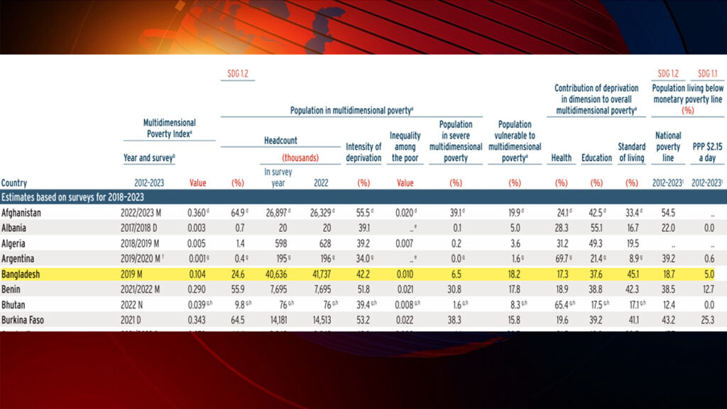 প্রতিবেদন অনুযায়ী, বাংলাদেশে দারিদ্র্যের ক্ষেত্রে সবচেয়ে বেশি ভূমিকা রাখছে মানুষের জীবনযাত্রার মান। এক্ষেত্রে দারিদ্র্য সূচকে দেশটির মান ৪৫ দশমিক ১ শতাংশ। শিক্ষায় ৩৭ দশমিক ৬ শতাংশ ও স্বাস্থ্যে ১৭ দশমিক ৩ শতাংশ। সবমিলিয়ে দেশের চরম দারিদ্র্যে অতি মানবেতর জীবন যাপন ৪ কোটি ১৭ লাখ মানুষ।