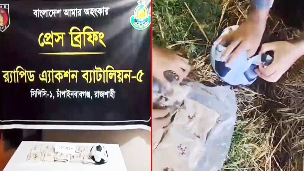 সন্দেহ হলে ফুটবলটি তল্লাশি করে এর ভেতর থেকে ২১টি প্যাকেটে মোট ২ কেজি ১০০ গ্রাম হেরোইন পাওয়া যায়।উদ্ধারকৃত মালামাল জিডির মাধ্যমে গোদাগাড়ী থানায় হস্তান্তর করা হয়েছে বলেও জানায় র্যাব।