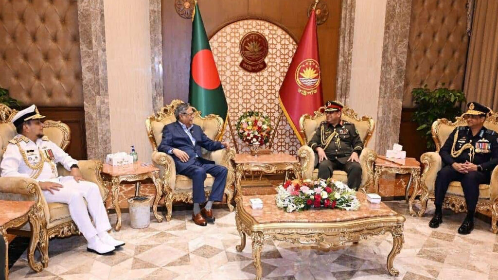 সশস্ত্র বাহিনী দিবস উপলক্ষ্যে রাষ্ট্রপতি মো. সাহাবুদ্দিনের সঙ্গে সৌজন্য সাক্ষাৎ করেছেন সেনাবাহিনী প্রধান জেনারেল ওয়াকার-উজ-জামান, নৌবাহিনী প্রধান এডমিরাল মোহাম্মদ নাজমুল হাসান এবং বিমান বাহিনী প্রধান এয়ার চিফ মার্শাল হাসান মাহমুদ খাঁন। বৃহস্পতিবার (২১ নভেম্বর) সন্ধ্যায় বঙ্গভবনে তিন বাহিনী প্রধান রাষ্ট্রপতির সাথে সাক্ষাৎ করেন।