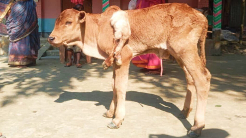 শুক্রবার (২২ নভেম্বর) দুপুরের দিকে উপজেলার বামনডাঙ্গার রামদেব গ্রামের কৃষক জাহাঙ্গীর আলম জিন্নাহর বাড়িতে বাছুরটির জন্ম হয়। জন্মের পর দেখা যায় বাছুরটির চারটি পা থাকলেও ঘাড়ের ওপড়ে আরও দুইটি পা রয়েছে।