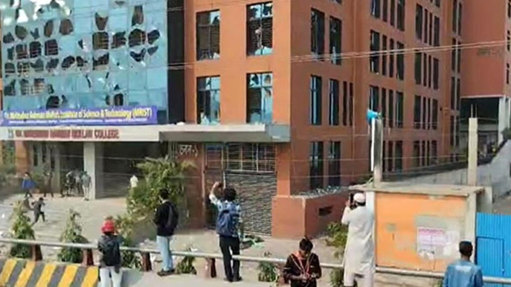 বিক্ষোভের পর ড. মাহবুবুর রহমান মোল্লা কলেজে (ডিএমআরসি) হামলা, ভাঙচুর চালিয়েছে বিক্ষুব্ধ শিক্ষার্থীরা। ঢাকার ন্যাশনাল মেডিকেল কলেজ হাসপাতালে এক শিক্ষার্থীর মৃত্যুর ঘটনায় সৃষ্ট পরিস্থিতির জেরে এ ঘটনা ঘটে। এ ঘটনায় বেশ কয়েকজন শিক্ষার্থী আহত হয়েছেন।