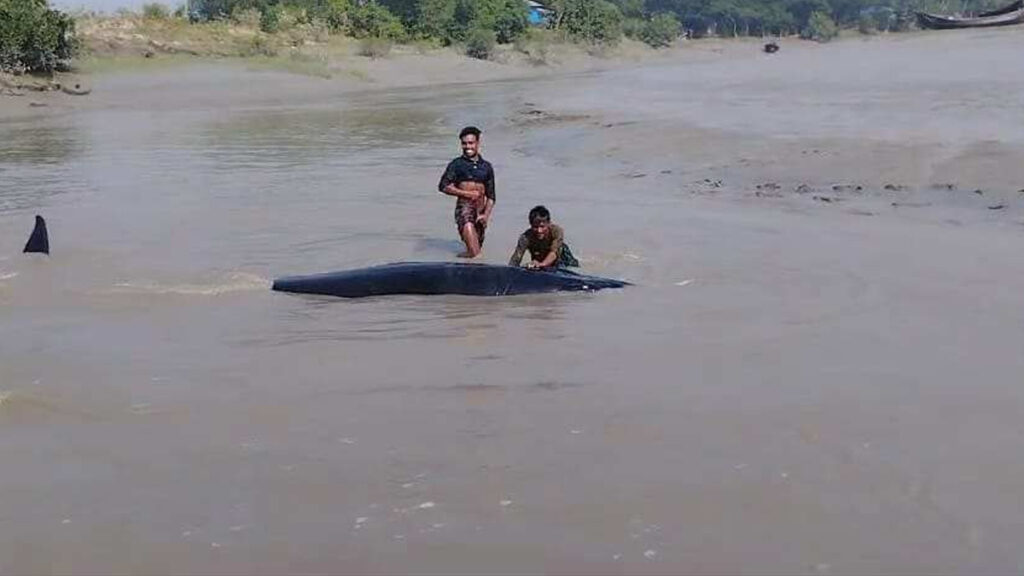 নোয়াখালীর হাতিয়ার মেঘনা নদীর তীরে চর আতাউরে জোয়ারে টানে ভেসে এসেছে বড় প্রজাতির নীল তিমি। বৃহস্পতিবার (৫ ডিসেম্বর) দুপুরের দিকে এই নীল তিমিটি দেখতে পান স্থানীয় জেলেরা। পরে তারা এটিকে দড়ি দিয়ে বেঁধে নদীর কিনারায় আনার চেষ্টা করেন। এ সময় তিমিটির গায়ে আঁচড়ের দাগ দেখা গেছে। খবরটি ছড়িয়ে পড়লে উৎসুক জনতায় এসে দেখতে যায় নীল তিমিটিকে।