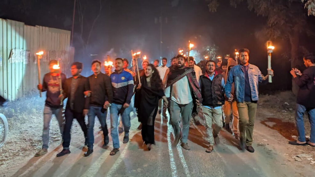 সোমবার (১০ ডিসেম্বর) রাত পৌনে নয়টার দিকে বিশ্ববিদ্যালয়ের বটতলা এলাকা থেকে এই মশাল মিছিল বের করে শিক্ষার্থীরা। মিছিলটি বিশ্ববিদ্যালয়ের বিভিন্ন সড়ক প্রদক্ষিণ করে একই স্থানে এসে সংক্ষিপ্ত সমাবেশের মাধ্যমে শেষ হয়।