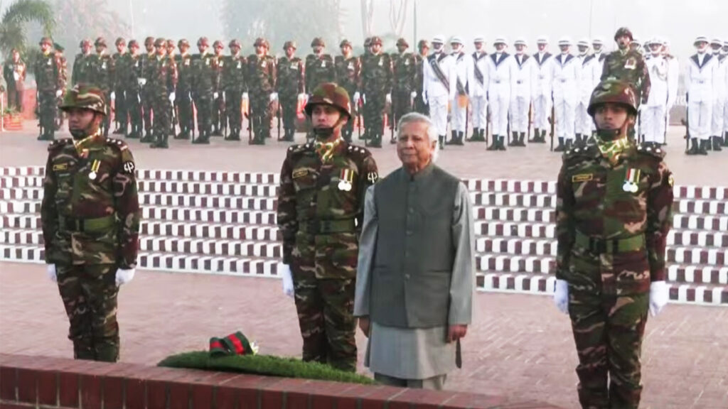 পুষ্পস্তবক অর্পণের পর প্রধান উপদেষ্টা ১৯৭১ সালের মহান মুক্তিযুদ্ধের বীর শহীদদের স্মৃতির প্রতি বিনম্র শ্রদ্ধা জানাতে সেখানে কিছু সময় নীরবে দাঁড়িয়ে থাকেন।