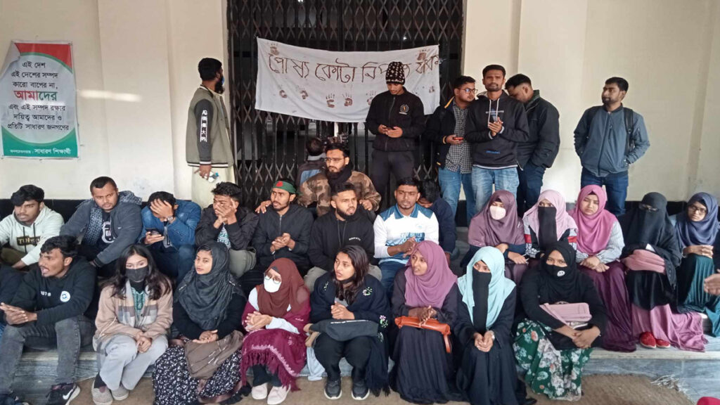 এ সময় আন্দোলনকারী শিক্ষার্থীরা ‘পোষ্য কোটা নিপাত যাক, মেধাবীরা মুক্তি পাক’, ‘লড়াই লড়াই লড়াই চাই, লড়াই করে বাঁচতে চাই’, ‘পোষ্য কোটার বিরুদ্ধে, আগুন জ্বালো একসাথে’সহ বিভিন্ন স্লোগান দেন।