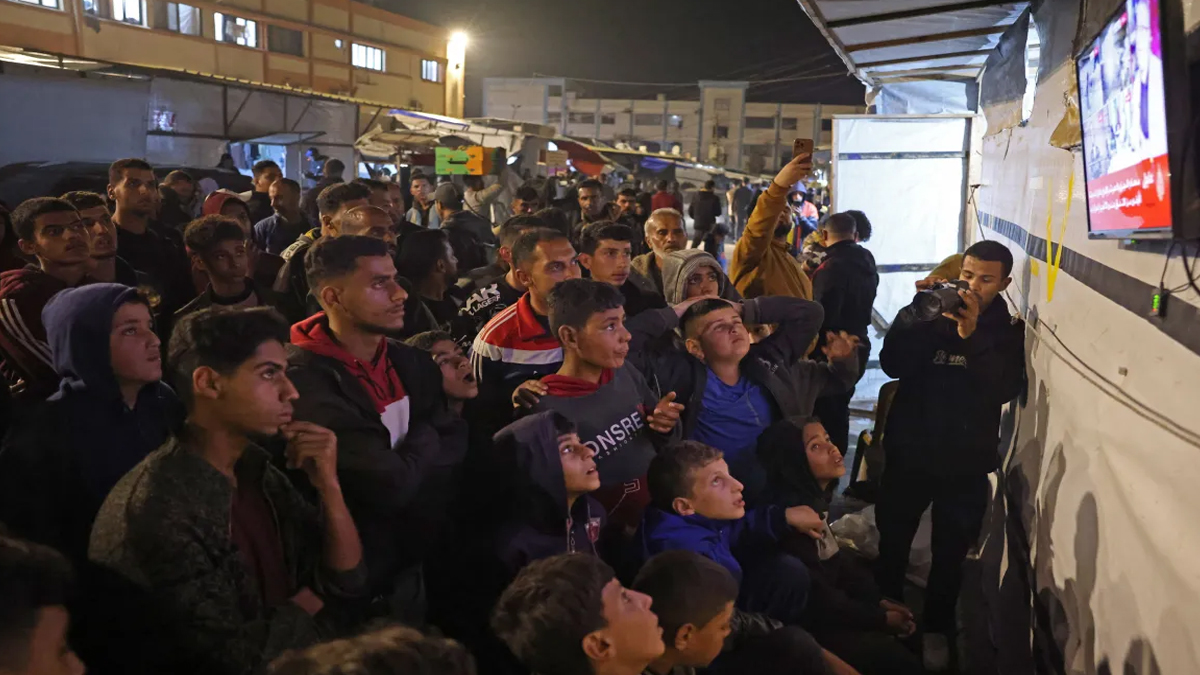 খান ইউনিসে সড়কের পাশে টেলিভিশনে যুদ্ধবিরতির খবর দেখছেন ফিলিস্তিনিরা