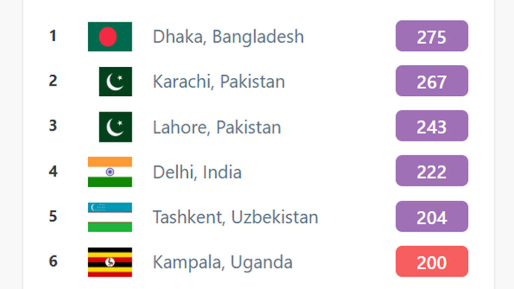 পাশাপাশি তালিকায় দুই নম্বরে ২৬৭ স্কোর নিয়ে আছে পাকিস্তানের করাচি। অর্থাৎ এখানকার বাতাসের মানও নাগরিকদের জন্য খুব অস্বাস্থ্যকর। ২৪৩ স্কোর নিয়ে তৃতীয় স্থানেও রয়েছে পাকিস্তানের আরেকটি শহর; লাহোর।