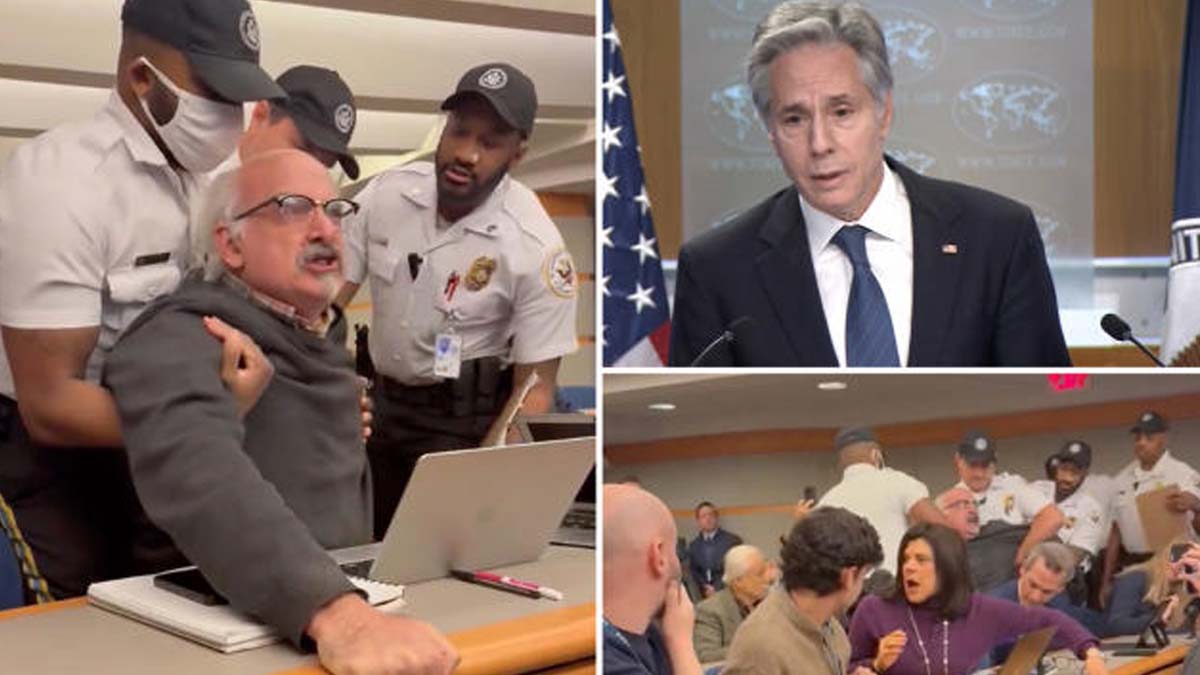 স্যাম হুসেইনি নামের একজন সাংবাদিক চিৎকার করে বলেন, ‘অপরাধী!’ এ সময় নিরাপত্তাকর্মীরা হুসেইনিকে জোর করে কক্ষের বাইরে নিয়ে যায়। বাইরে নেওয়ার সময়ও তিনি অ্যান্টনি ব্লিনঙ্কেনের উদ্দেশে অবমাননাকর নানা প্রশ্ন ছুঁড়তে থাকেন।
